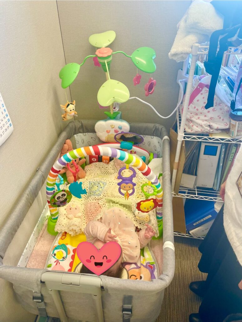 秘書室には、赤ちゃんを連れて働く秘書の方がおり、部屋の角には小さなベビーベッドが置かれていました。